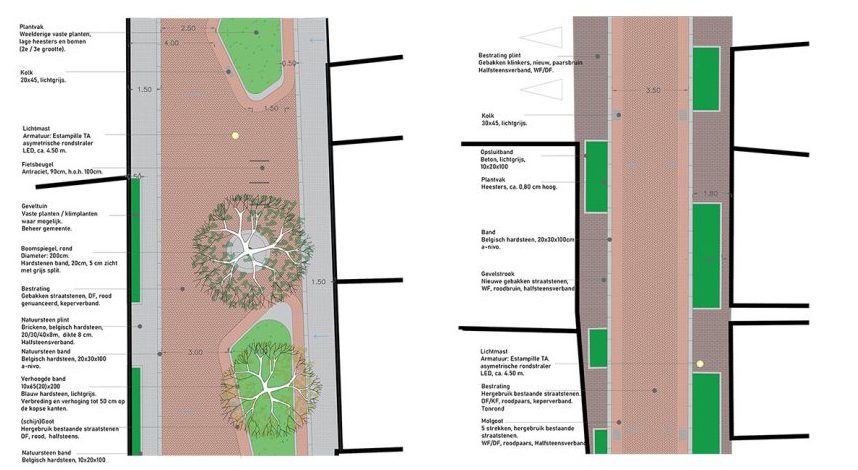 Ons ontwerp bestaat uit verharding van gevel tot gevel. De historische Hollandse stoep komt terug in het straatbeeld: de anderhalve meter brede plint van natuursteen biedt ruimte aan uitstalling, een terrasje of een geveltuin. Je vindt de plint in het hele centrum terug. Dat zorgt voor eenheid.
