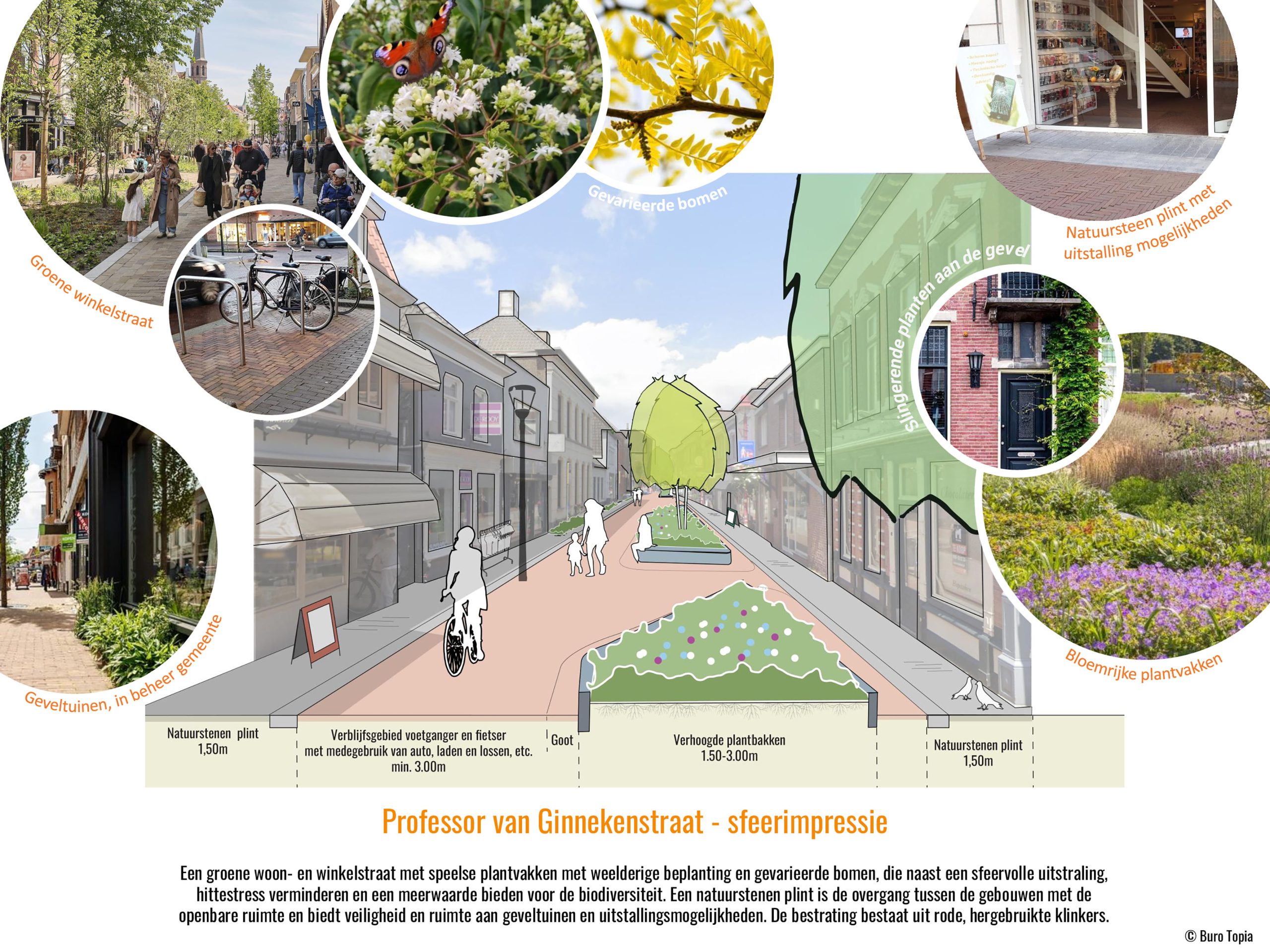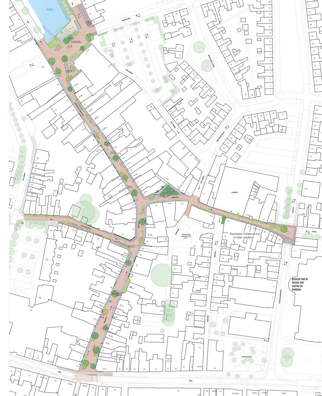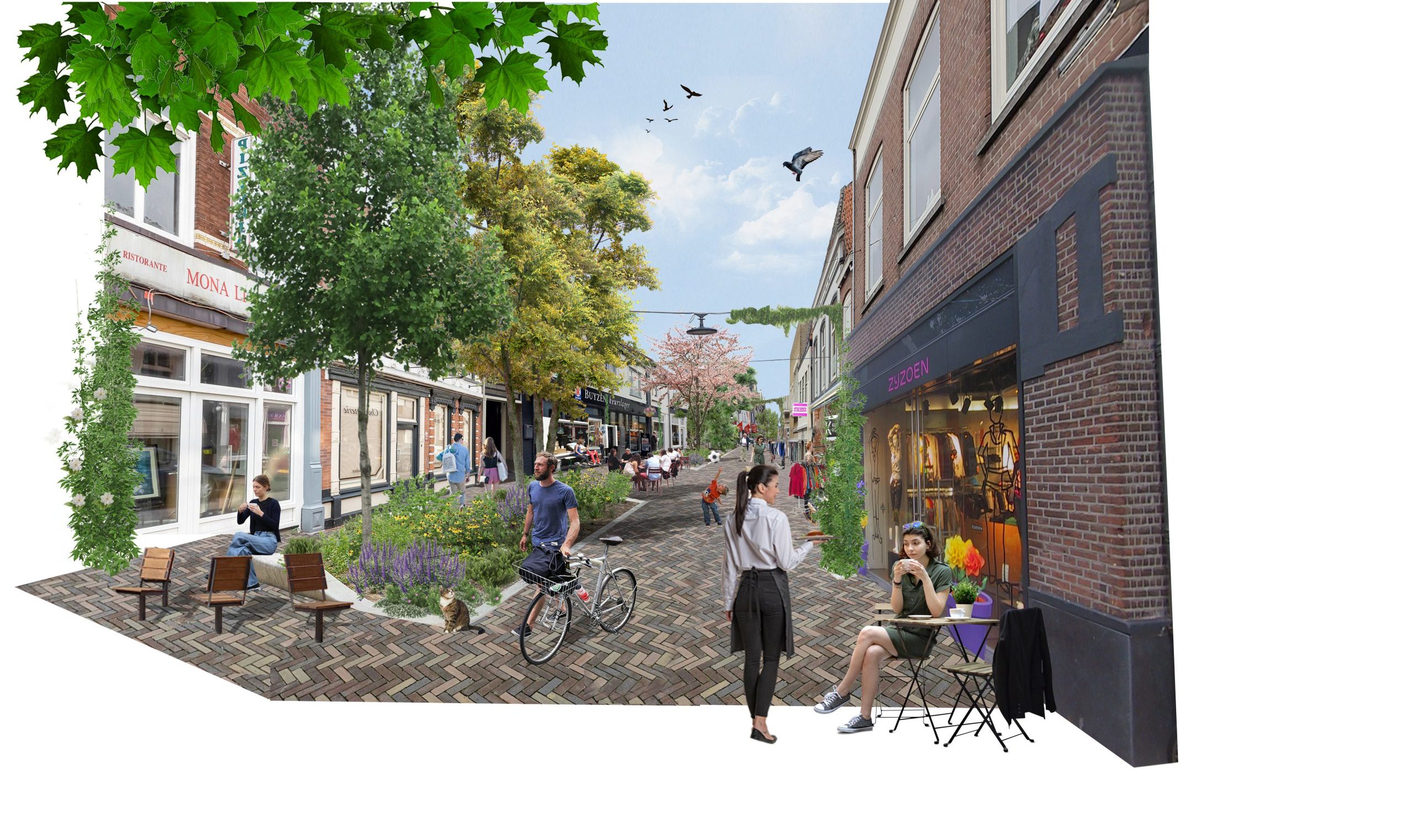 Een deel van de straten wordt autoluw. Grote verhoogde plantbakken met kleurrijke bloemen, gevarieerde bomen en informele zitplekken maken de straten gezellig. Het groen zorgt voor verkoeling op hete dagen, versterkt de biodiversiteit, en stuurt het verkeer op een vriendelijke manier. Een fontein en een vrolijk beeld van een varken nodigen uit tot spelen, ontmoeten en ontdekken.