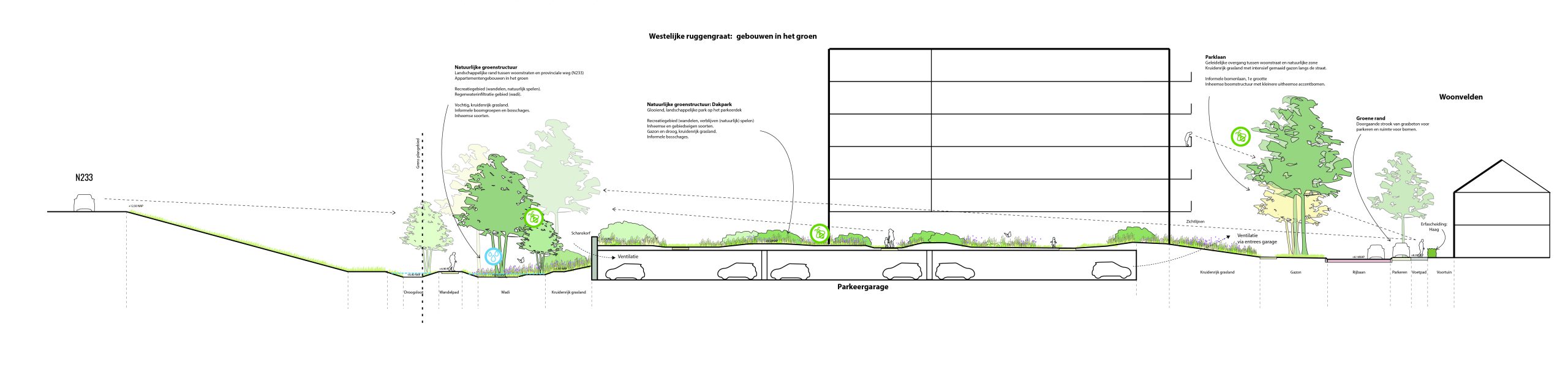 Ook de appartementengebouwen krijgen een groene omlijsting. Rondom ligt een openbare daktuin die naadloos aansluit bij het landschap eromheen. Met gevarieerde beplanting en slingerende paadjes is het een plek waar de natuur en het dagelijks leven samenkomen.